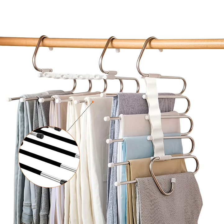 - Maximize your closet space with our 5-in-1 design, holding up to five pairs of pants on a single unit.
